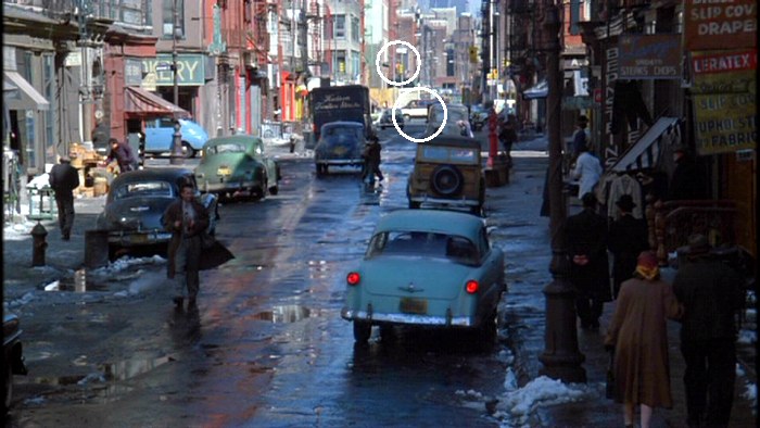 I love this movie, so I don't want to get all anal-retentive on its ass, but you'll notice that the street scene below has some sloppy and obvious anachronisms. In the two circles you will see (a) a vehicle that did not exist in the mid 50s, and (b) traffic signals that did not exist then.
