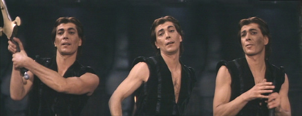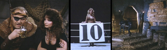 Then the director figures, oh, hell, we don't have realistic period props, and we can't afford them, so let's just use modern stuff. Therefore, the medieval bad guys drink their beer out of A&W Root Beer glasses; the wrestling match takes place in a modern ring with "card girls" and 20th century cars parked in the background; the signs say things like "Open 24 hours"; and everyone hangs out in strip joints and watches nude mud wrestling.