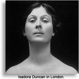 You well may wonder how Isadora and Yesenin could have gotten together in the first place. They were linked by both art and politics. Inspired by the idealism of the workers' revolt, Isadora spent a considerable time in Russia just after the revolution. That country embraced her as a fellow revolutionary and gave her an old palace to use as a dancing school. The 26-year-old Yesenin was then considered one of Russia's greatest artists despite his youth, and was a spectacularly handsome hunk. The two sexually-charged artistic spirits met, and nature took its course. Yesenin would accompany Isadora on an American tour in 1922-23, but his alcoholism fueled frequent destructive rages, similar to the hotel room rampages of today's rock stars, and those incidents caused much negative publicity for both of them, but probably not as much as their politics. The occasional trashed hotel room was probably more acceptable in the United States than their fanatical Marxism. During a performance in puritanical, capitalist Boston, she managed to combine "immorality" and Communism in a single stage performance, by baring her breast while waving a red scarf and proclaiming, "This is red! So am I!"