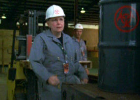 Mr. Hell (Harry Eugene Loveless - H.E.L. - get it?) drifts from town to town using menial jobs to support his alternate lifestyle, which basically consists of murdering people and cutting their eyes out. He met his demise early in the film when he was chasing a precocious child through some industrial tunnels and was saturated with toxic acid, thus converting him to liquid form. His liquid remains were stored in a toxic waste container for fourteen years until some clumsy workers spilled him on the floor and brought him back to life. He somehow managed to re-form into human shape, except this time with super-human strength and speed.
