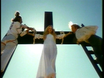 It has all the usual requirements for hippie-era filmmaking: a nearly complete lack of dialogue, youth gangs wearing mime make-up, Seventh Seal rip-offs, sitar music, psychedelic "trips," dream sequences, paintings coming to life, and of course a crucifixion. Oh, and nudity. The reason I watched it, of course, was to see pre-Eastwood nudity from Sondra Locke. Here are some sample captures: |