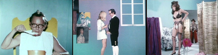 Back around 1970 or so, a fella named Don Joslyn saw that his acting career was stagnating, and decided that he wanted to direct. Before turning out his one and only film, he had to overcome a few problems, like (a) he had no idea how to direct a movie, and (b) if he could have learned how, he wouldn't have had enough money. In fact, to be more specific, he didn't have any money. To his credit, he did not let these minor issues stand in the way of assembling 90 minutes worth of footage featuring Wally "Underdog" Cox, Julie "Catwoman" Newmar, and a popular 350-pound former Shakespearian actor named Victor Buono. Like Newmar, Buono had played a villain (King Tut) on the campy Batman TV series. What a cast! Instead of watching them in a story, I felt like I should have been feeding them softball double-entendre questions.