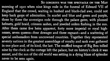 Barbara Tuchman won a Pulitzer Prize for her description of this era in "The Guns of August" (paperback info from Amazon), and I won't attempt to match her accuracy or her eloquence. Here is how she put it: