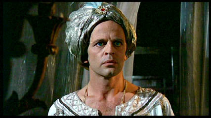 There is also some weird sub-plot with Klaus Kinski as an ancient caliph who tortures his slave girl until she gains the upper hand and tortures him. (Kinski is pictured to the right. Is that guy Turkish looking, or what?). And then they keep coming back to life and torturing each other for generations. Well, as luck would have it, the sub-plot winds in with the main plot. The dead woman on the beach is also the ancient slave girl, and the guy who killed her is Kinski. Then, when the slave girl comes back to life in Rio, she sleeps with Darren, and decides to go back to Istanbul to get her revenge on Kinski so their sadomasochistic cycle can continue ... ... except that Kinski and Dead Chick apparently didn't see the ending of the movie, because if Darren is dead, then she's hasn't really come back to life, but merely back to his limbo world. So maybe Dead Chick in Furs is just stopping by in limbo on her way between death and life, presumably because she just had to hear Darren sing "Goodbye, Cruel World" one last time. Whatever. |