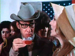 Harvey's acting in the film is predictably intense and haunted and joyless (right), as you might expect from a man playing a tragic cannibal while he himself was dying of cancer, but that was just typical grade-B stuff, and would not serve to make the film especially memorable. His direction is what makes the film really shine with incompetence. The musical score, for example, is non-stop elevator music, capped off by a Lou Rawls love ballad which is crooned in the performer's characteristically mellow style over the opening and closing credits. If that weren't enough to destroy the tone of a cannibal film, there's also the standard comic relief that can only be provided by a wacky incompetent deputy doing a Woody Allen impersonation (left)!